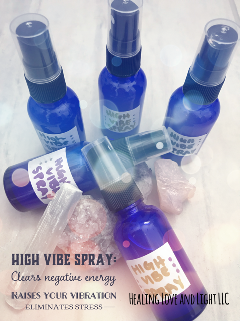 A few weeks ago I was standing in front of my altar in my healing room. I was wishing I had a spray that combined my favorite smells, that I could use as something to raise my vibration. I started to mix a beautiful smelling potion. I brought it to work with me the next day and started spraying it on one of my friends, Brittany. She instantly asked if she could buy a bottle. Within a few days I had bought all the supplies I needed and set off to make the "High Vibe Spray". It was a few days before the full moon and I knew what I needed to do. I made the spray and mixed it all in a large jar. I put some of my favorite crystals in the jar as well. Over that weekend I had set it outside in the full moon energy. The crystals and the energy from the full moon really amplified the high vibration of the spray!